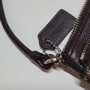 Features coated canvas, wrist strap, one side can be unhooked so strap can be tucked inside, Coach logo on front, signature coach C's on outside, double zipper, each pocket is lined in brown fabric, 3 card holders built into back compartment, made in China