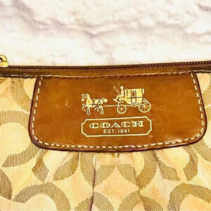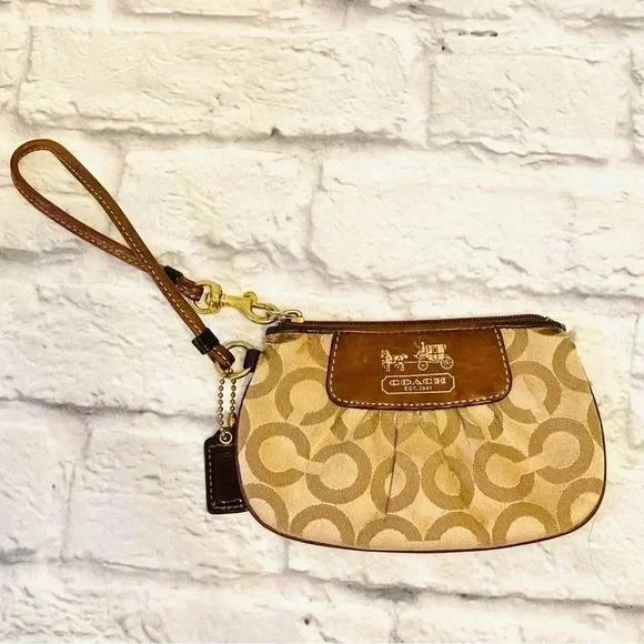 Coach Signature Wristlet Tan with Brown Leather & Gold Hardware.