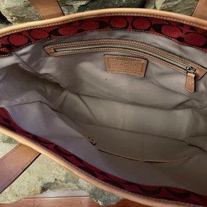 Coach Signature Zip Top Tote Red Canvas Tan Leather Trim Handbag. Zip top. Slim outer pocket. Inner open and zip pockets. Preowned and some water spots on tan leather bottom. Very clean otherwise. Very nice condition.