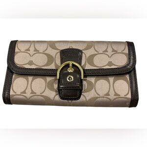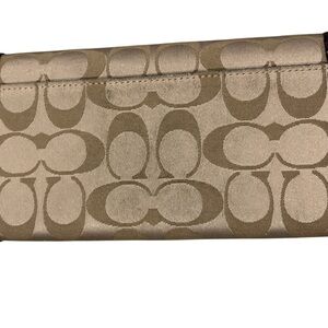 Chic Coach clutch with signature pattern. Features tan and black design. Gold-tone buckle accent. Ideal for stylish outings.