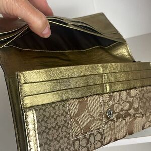 Material: Coach logo fabric & gold snake embossed leather trim, gold leather interior with dark brown satin lining.