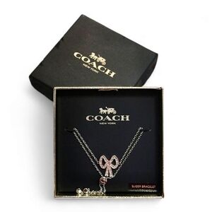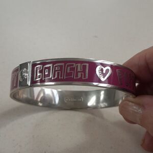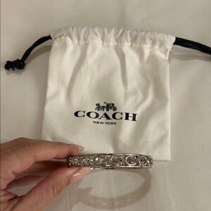 This is a silver Coach bangle bracelet. It is new and has never been worn. It is in excellent condition. The bracelet is made of silver and has a textured design. It is a classic and elegant piece of jewelry that would make a great gift.