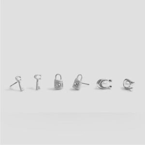 Elegant silver earring set by Coach. Includes lock and key designs.