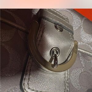 Classic Coach crossbody in silver/grey signature jacquard with metallic leather trim and buckle detail.