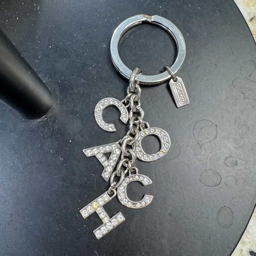 Stylish Coach keychain with sparkling rhinestone letters. Ideal for bags or keys.