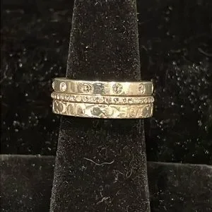 Here is a set of stacking rings by Coach. Two of the rings have crystals inset, and one of them has coaches C’s I don’t think it’s sterling silver because it has never tarnished, but because it was Coach, it was expensive.