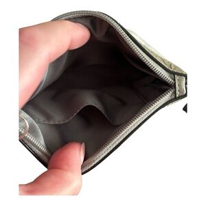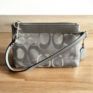 Chic Coach wristlet with signature pattern. Sleek silver and gray tones. Perfect for everyday elegance.