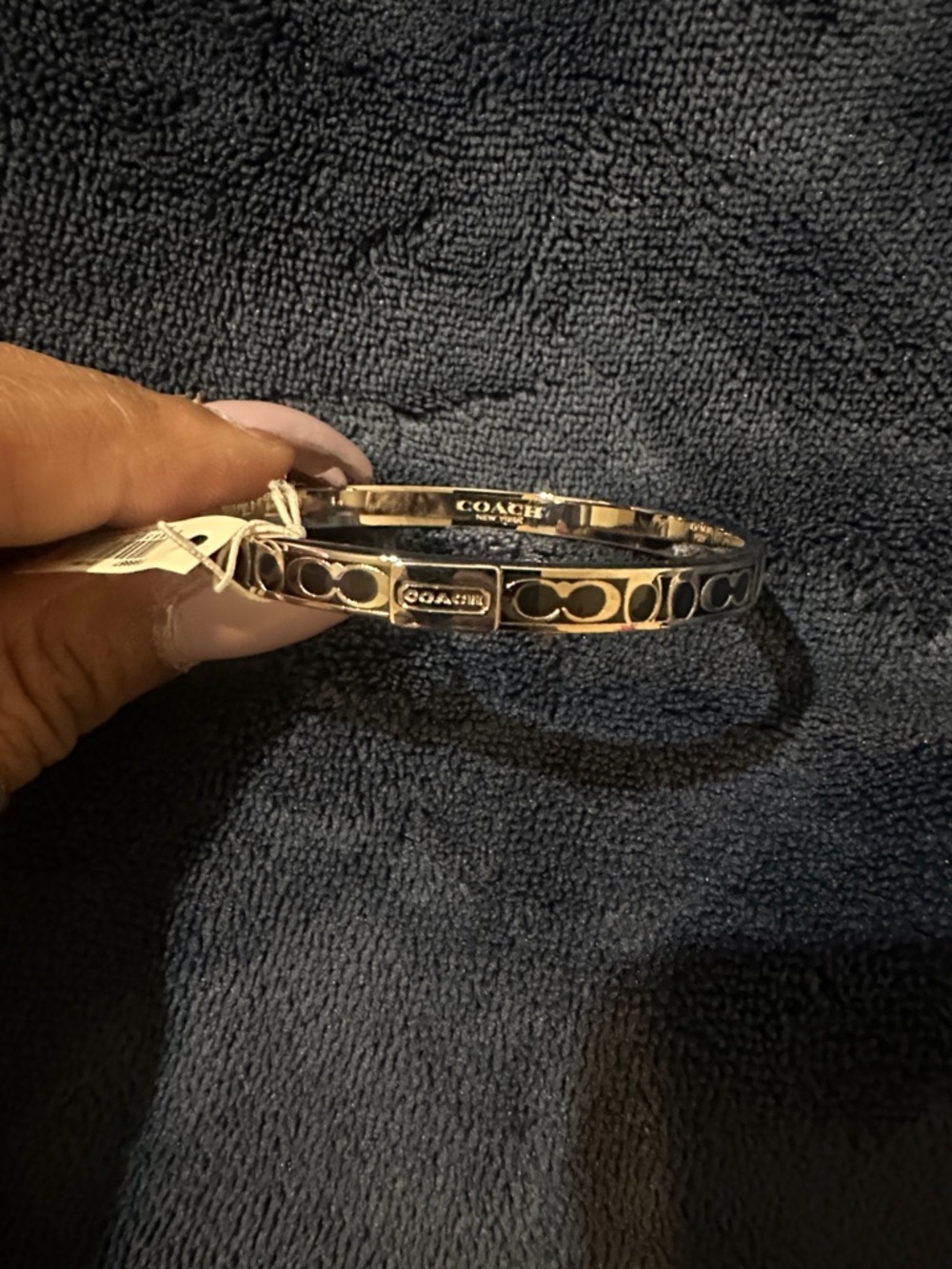 Classic Coach bangle with bright silver finish. Smooth circular design for layered or standalone wear. Simple and versatile for many looks.