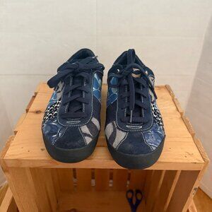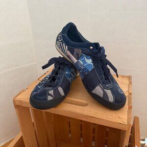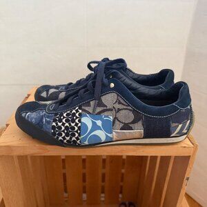 Coach sneakers, patchwork shoes, denim sneakers, women's casual shoes, navy blue shoes, lace-up sneakers, casual footwear, stylish sneakers, blue sneakers, designer sneakers, comfortable sneakers, size 10 sneakers, Coach denim shoes, designer shoes, luxury shoes, low top shoes, tennis shoes, athletic sneakers, athleisure sneakers