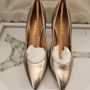 Coach "Skylar" Metallic Champagne Pumps. NIB. Size 6. NIB/Original box/packaging. No rips/stains/scuffs/tears/peeling or wear. Brand new. Box has minor damage. Smoke free home. No odors. All offers are welcome. Thank you!