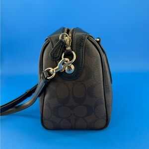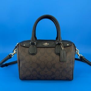Coach Mini Bennett Satchel in Brown signature coated canvas with Black textured leather Trim & accents. Gold Hardware. This style features a zip-top closure, fabric lining, and both a top handle with a 4” drop and an adjustable detachable strap with a 23-24” drop.