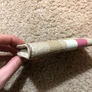 Small credit card wallet by coach. Has one credit card slot and one zippered pocket. In fair condition: see pictures for pink color on zipper and wear on fold.