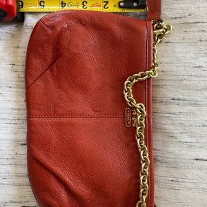 Genuine Coach Leather Handbag with Gold Chain. This mini-purse/clutch is amazing and actually holds quite a bit! Deep/burnt orange, in perfect condition! Measures about 9” x 5”