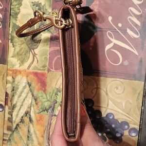 Coach logo wristlet, like new. A mix of canvas and leather. Front leather patch pocket. Zipper closure with strap. Strap may be unhooked only on one side and used to attach to another purse or bag. EUC. Brown leather, beige logo canvas.