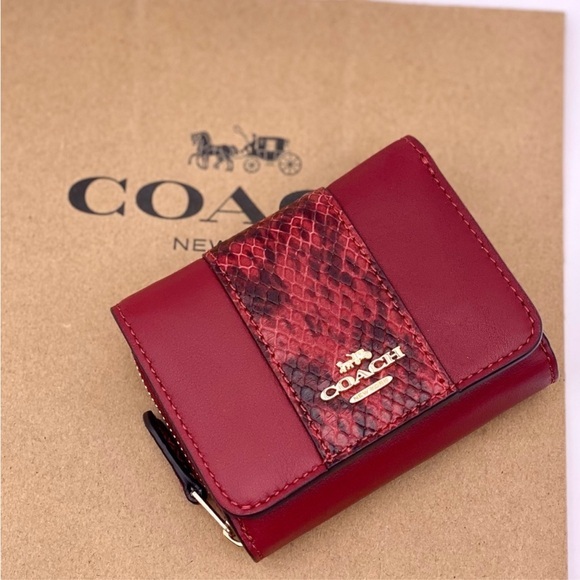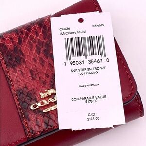 Chic Coach wallet in chrrry color with snake print accent. Stylish and functional design. Perfect for everyday use.