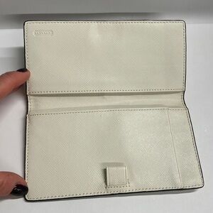 This is a great Coach Smooth Polished Pebbled Cream Metallic Leather Checkbook Wallet Cover. A couple of very minor scuffs as shown. No odors. No tears. Triple compartment. Pen loop. 6.5” x 3.5”