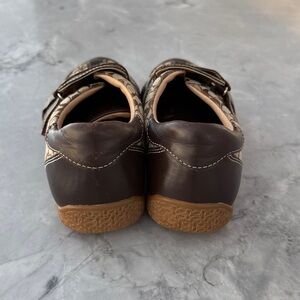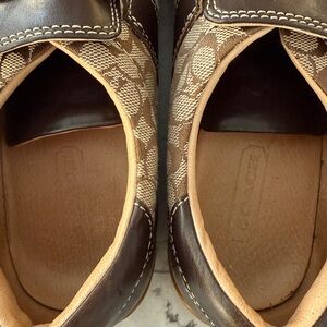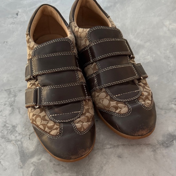Stylish Coach Susanna sneakers in beige/brown with leather velcro straps. Size 9. Slight scuffing in toes as shown in photos.