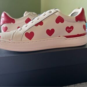Stylish Coach Lowline Valentines sneakers with vibrant red heart pattern. Chalk/Sports Red. Perfect for casual outings.