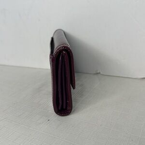 Made with Coach patent leather Color: SV/Plum Front buckle, snap closure Matching color leather interior & soft fabric lining 14 credit card slots, 4 open slip pockets (cash pockets) 1 zipped coin pocket with leather pull 1 backside open slip pocket