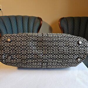 Coach Soho EUC Signature Flap Leather Black Grey Handbag. Leather handle and trim in perfect condition. Snap closure, silver hardware, 4 feet. 3 pockets inside, one is zippered. Handle drop 8". 6"x8 1/2"x14.