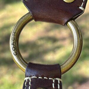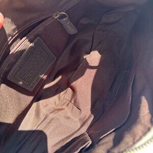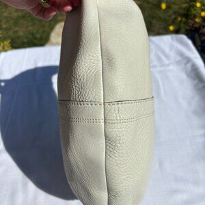 This beautiful, hard to find Coach bag is in excellent condition! It is a slightly off white color with brown and gold colored accents. Measures approximately 10"H x 16"W. The strap is 14" end to end with a 9" fall from top of the braided strap to the purse in the middle.