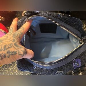 Coach Blue tweed, blue suede, sequins, leather flowers. Eye-catching and unique Coach bag.