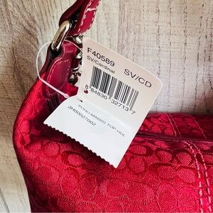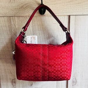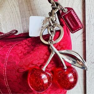 signature monogram, mini handbag, top handle, cherry charm, leather texture, designer purse, compact, structured, luxury accessory, vibrant red.