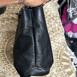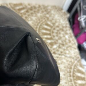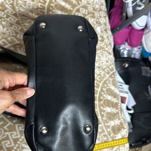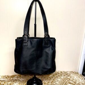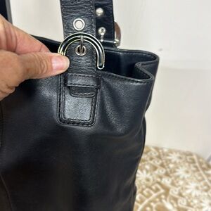 Coach Soho North South Tote Womens Black Leather. Leather handle straps. Roomy interior. Three compartments (two open / one zipper (middle)). Buckles. Magnetic snap closure. Blue grosgrain lining. Zippered accessory pocket. Two side pockets. Metal foot rests on base. Preowned has minimal wear on bottom corners, surface scratches(leather like butter) and inside could be cleaned. Lots of life left in this Great bag
