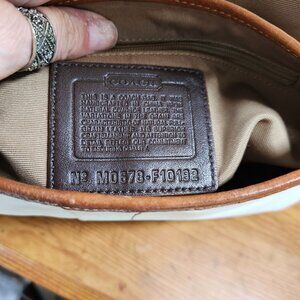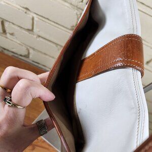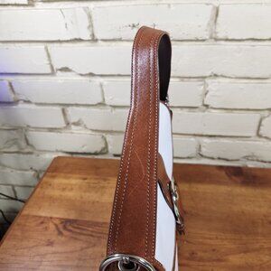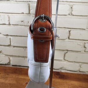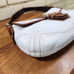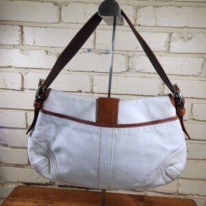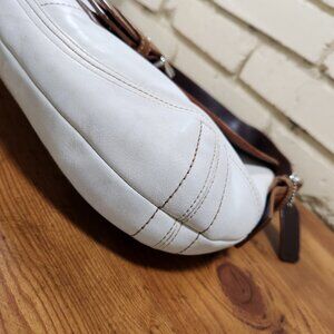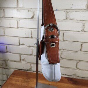 This coach shoulder bag is a perfect addition to your wardrobe. The bag features a white pebbled leather with brown geniune leather strap and trim..