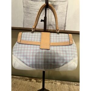 The Coach Soho Pink & Blue Pastel Buckle Hobo with Leather Top Handle Vintage 1822 is a stylish and spacious medium-sized beautiful, hobo handbag designed for women. Featuring a plaid pattern on the exterior with a pink and blue color scheme, this hobo bag has a unique crescent shape and a silver buckle closure. The top handle is made of pink leather, adding a touch of luxury to the design. The lined interior, crafted with leather material, provides a comfortable and durable space for storing essentials. This vintage Coach handbag from the Soho collection is a chic and versatile accessory for any outfit.