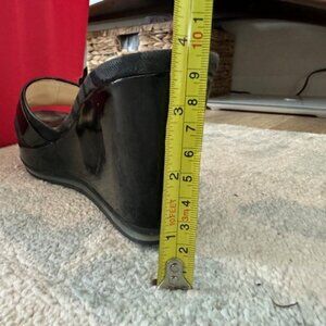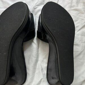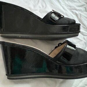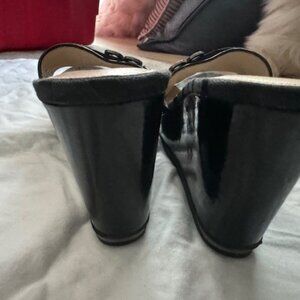 Coach Stacked Heel Shoe hardly worn, you can see on bottom there is no signs of wear. Little dusty from closet. Black coach logo pattern, patten leather sides no scratches. Mint condition.