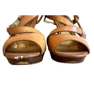 Coach Strappy Leather Platform Sandals in British Tan, size 6. Good preowned condition with a scuff on the front of one shoe and a few nicks on the heels. Gold buckle detail and logo hardware.