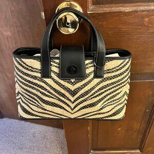 Coach Woven Straw Zebra Striped Tote with Black Leather Trim