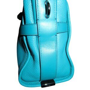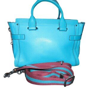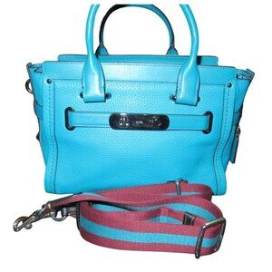 This Coach Swagger 27 satchel offers style and versatility with its 2WAY design. Crafted in luxurious turquoise leather with striking gunmetal hardware, perfect for any occasion. Use it as a satchel or crossbody.