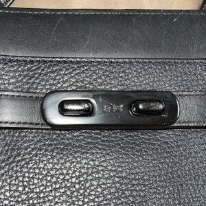 Elegant black leather handbag by Coach. Features premium craftsmanship. Removable strap. No corner wear. The hardware is showing residue or scratching on hardware. I did not notice until flash picked up. Adorable bag.