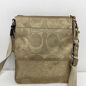 Coach Swingpack Stud Lurex Gold Jacquard Cross Body Bag style 46841. This is limited edition coach gold stud lurex swingpack crossbody bag, gold tone signature fabric,with shimmering metallic C's. Strap in a light cream color with leather shoulder pad for comfort. There are two open pockets front and back. interior lined in purple sateen, top zip closure gold leather trim and hangtag. This bag in EUC, beautiful bag with no stains, rips or tears. Adjustable strap 25”