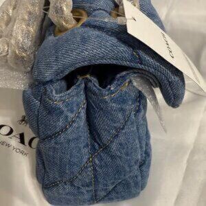 Stylish blue quilted denim shoulder bag with gold-tone hardware. Perfect for casual outings. Length: 10.25" Height: 5.5" Width: 3.25" Materials Denim and nappa leather Fabric lining Strap Chain strap with 21.5" drop for shoulder or crossbody wear Features Outside slip pocket Inside zip and magnetic snap pockets Pushlock closure