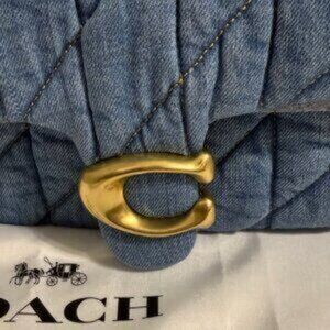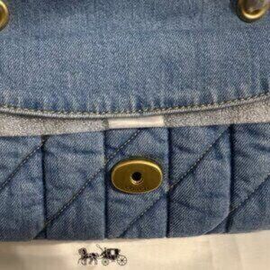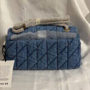 Stylish blue quilted denim shoulder bag with gold-tone hardware. Perfect for casual outings. Length: 10.25" Height: 5.5" Width: 3.25" Materials Denim and nappa leather Fabric lining Strap Chain strap with 21.5" drop for shoulder or crossbody wear Features Outside slip pocket Inside zip and magnetic snap pockets Pushlock closure