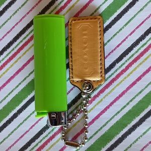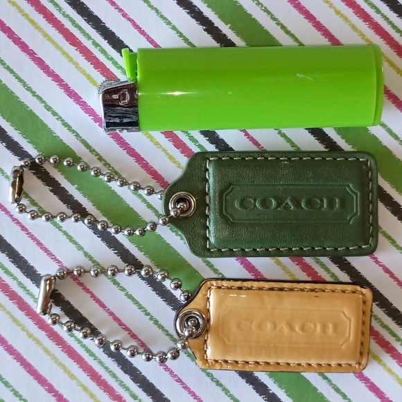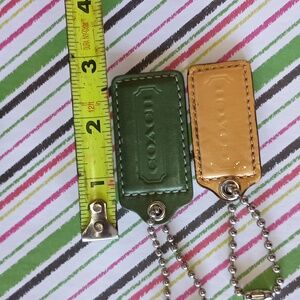 2 Coach tags one is a large green coach tag and the other is a medium tan coach tag the green one is 2 1/2 inches long and 1 1/4 inches wide and the tan one is 2 1/4 inches long and 1 inches wide