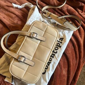 Stylish Coach mini satchel in tan. Features a sleek design with silver hardware. Ideal for everyday use.