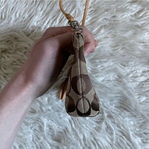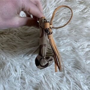 Coach wristlet bag features classic Coach signature design material, leather strap and details including leather tassel. Metal Coach tag. Brown cloth liner.
