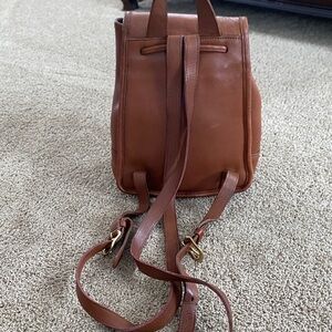 Elegant tan leather backpack with a classic turn-lock closure. Ideal for daily use.