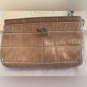 This elegant Coach clutch showcases a refined tan leather with a distinctive embossed texture, exuding sophistication and style. Its compact design is perfect for carrying essentials, while the metal strap detail adds a touch of modern elegance.