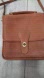 Stylish Coach messenger bag in tan leather. Features a sleek design with a top handle and adjustable strap. Ideal for everyday use.