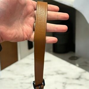 Elegant tan leather shoulder bag. Features adjustable strap. Sleek and stylish design.