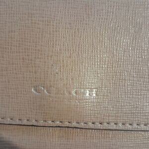 Elegant Coach wallet in tan leather. Features classic design and logo detail.