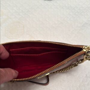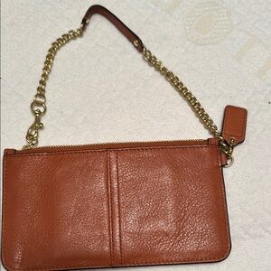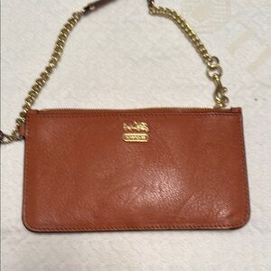 Chic Coach wristlet in tan leather. Accented with a gold chain strap. The edge/trim is a dark brown.