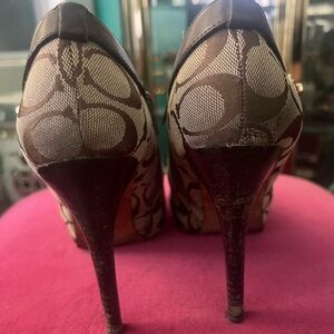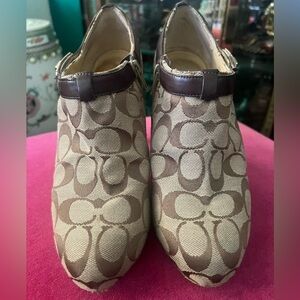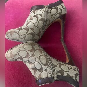 Coach Tan Monogram Booties. Approximately 3.5 inch heel with .5 in platform. Very steady and easy to walk in. Used Condition