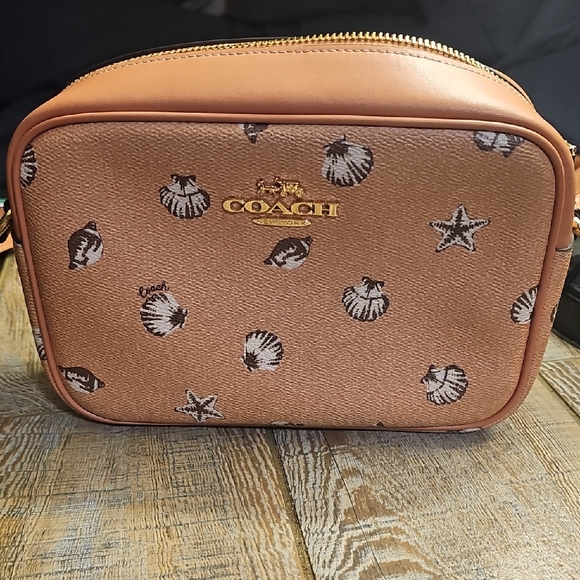 Elegant Coach crossbody purse with shell and starfish design. Tan leather with gold accents. Ideal for casual outings.