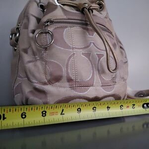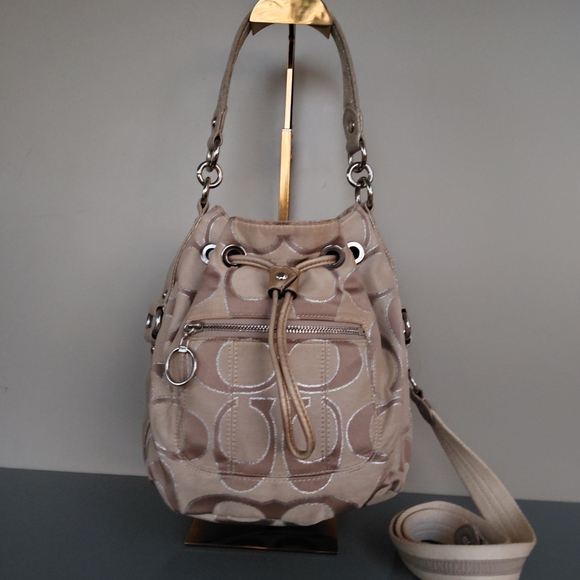 Chic Coach shoulder bag in tan. Features signature pattern and drawstring detail. Ideal for everyday use.